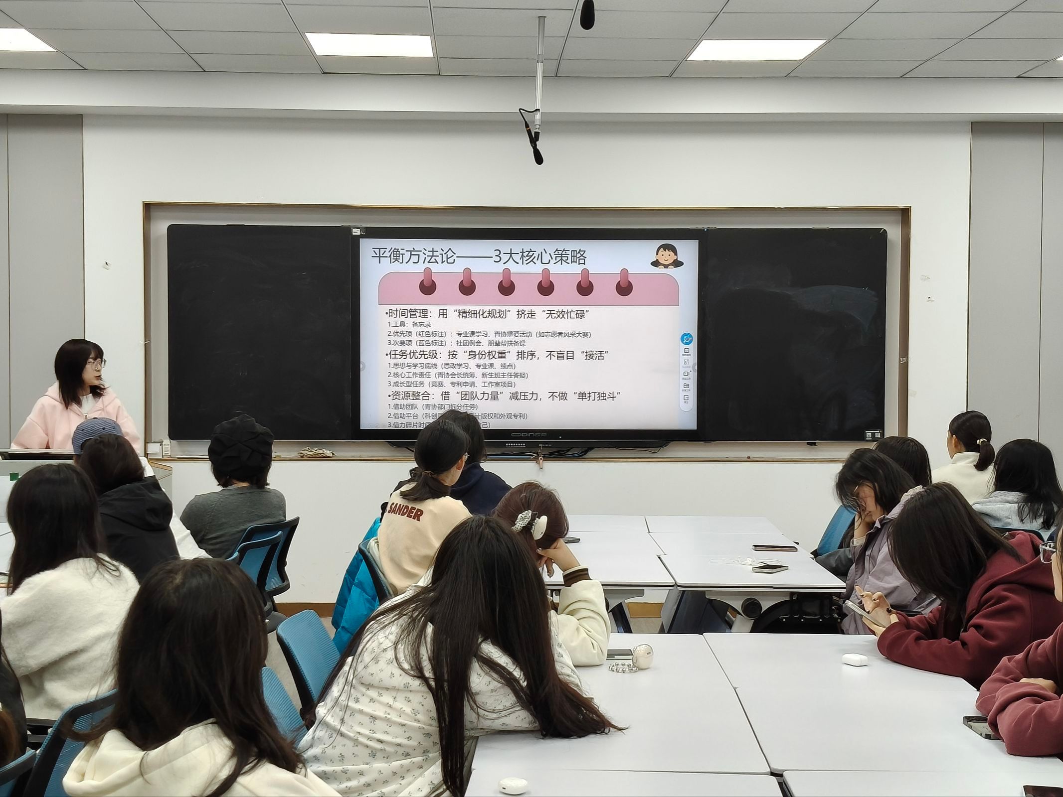 活动开始,朱雪蓉首先分享了自己通过 “平衡方法论” 等方法,高效的完成任务,平衡学习与工作的技巧。她也给学弟学妹们提出了许多建议,鼓励大家在实践中不断探索适合自己的方法。同学们围绕自身的生活和学习进行提问,朱雪蓉对同学们的问题进行了耐心解答和指导,现场气氛十分活跃。此次论坛不仅为同学们提供了实用的技巧,更帮助大家树立了 “以成长为核心” 的观念,为未来学业与职业发展奠定了坚实基础。