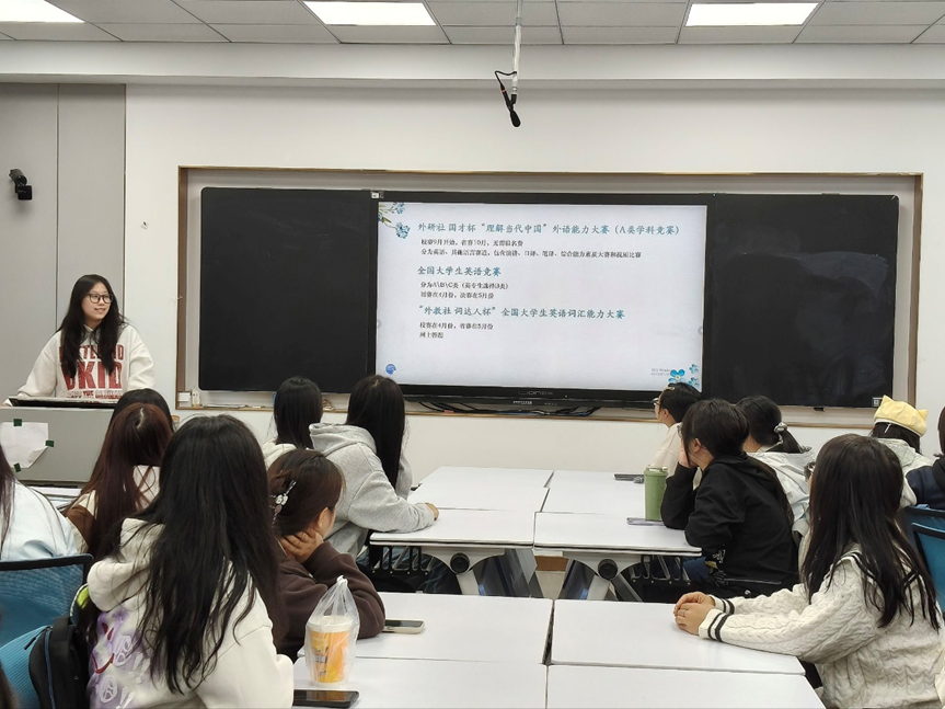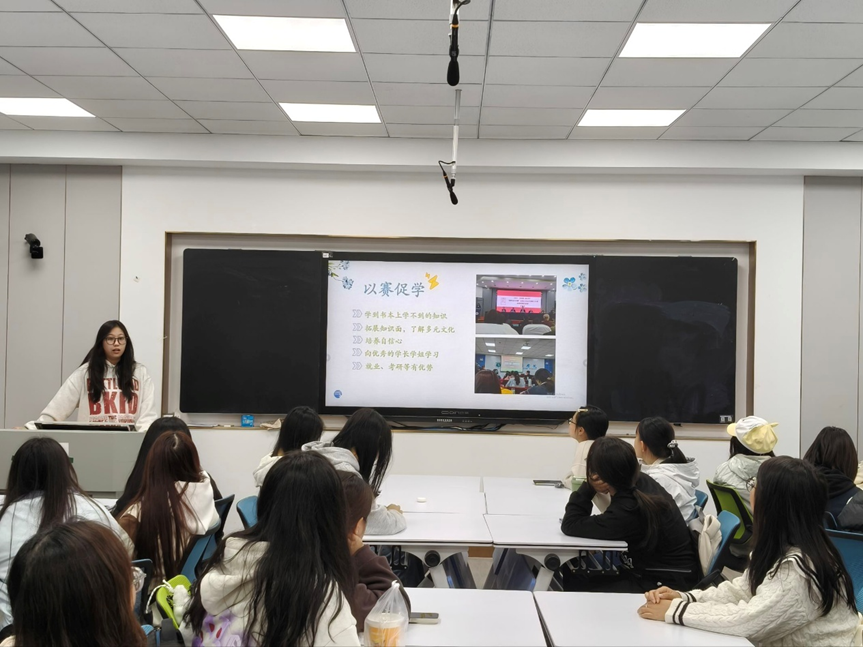 为了引导新生以赛促学、提升综合能力,为大学生涯奠定坚实基础。外国语学院于10月26日在美荟楼317教室举办“以赛促学,拓展视野”青年论坛活动。学院学生代表韦星宇及大一新生参加了本次活动。