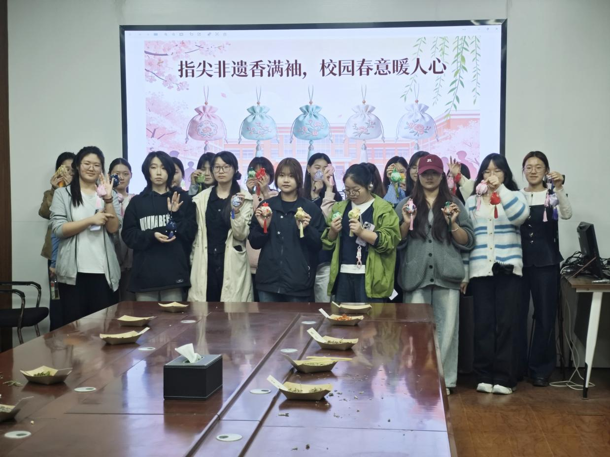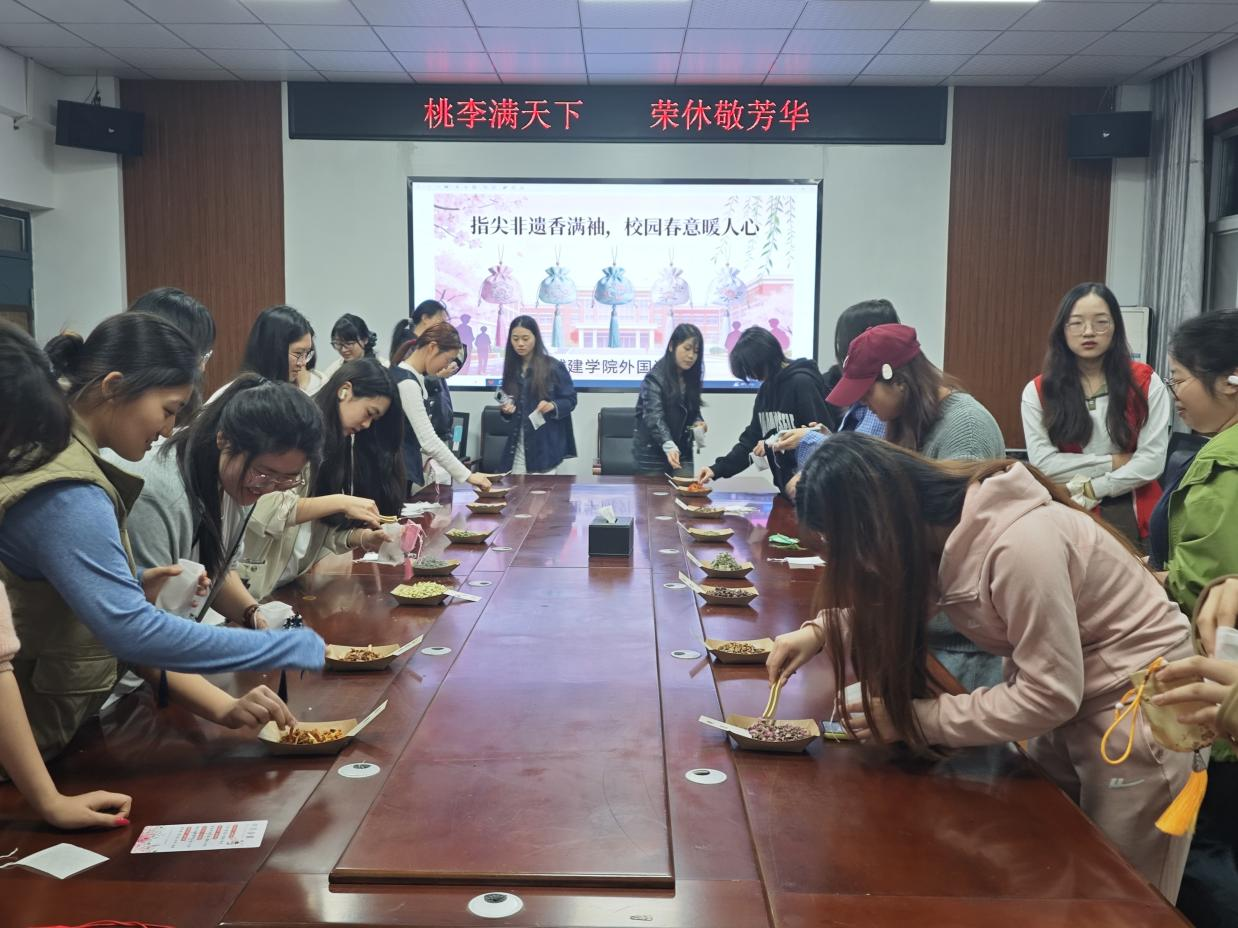 为弘扬中华优秀传统文化,让非遗技艺走进学生生活、感受传统手工艺独特魅力,落实学校“我为同学办件事”系列活动要求,3月29日,外国语学院在美荟楼306会议室举办非遗“古法香包”主题体验活动,30余名学生沉浸式感受古法香包的文化底蕴与制作乐趣。