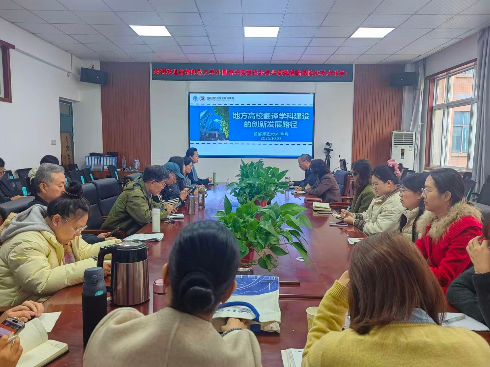 10月23日下午,中国英汉语比较研究会应用翻译专业委员会副会长、首都师范大学外国语学院副院长焦丹教授应邀至我院作题为《地方高校翻译学科建设的创新发展路径》的学术报告。外国语学院党委书记王宏、院长张换成、党委副书记代博君、副院长张凤琴和20余位教师共同聆听了报告。报告会由张换成主持。