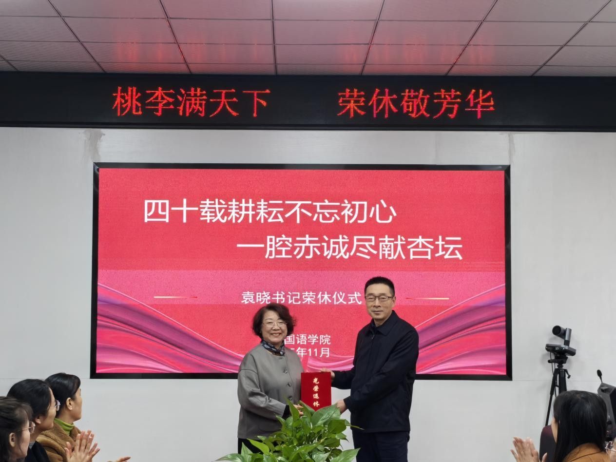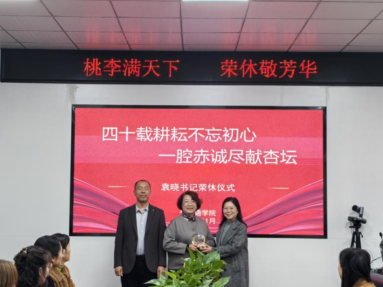 仪式伊始,王许涛宣读了学校关于袁晓同志退休的决定。随后,会议简要回顾了她的教育生涯。袁晓同志从教四十载,职业生涯深深扎根于外国语学院,曾担任团学办主任、外语系实验中心主任、外语系副主任、外国语学院党总支副书记、党总支书记等职务。无论在哪个岗位,她始终秉持高标准、严要求,是学院教学科研稳步提升的推动者,也是党建工作扎实开展的领路人。