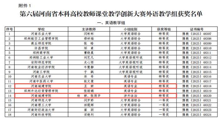 近日,河南省教育厅下发《河南省教育厅关于公布第六届河南省本科高校教师课堂教学创新大赛外语教学组、实验教学组、体育教学组获奖名单的通知》(教高〔2025〕235号)。我校外国语学院教师在外语教学组的比赛中,成绩喜人,再次实现各组别奖项大满贯,斩获特等奖2项,二等奖4项,充分展示了我校外语教师过硬的教学功底与创新能力。其中,王妍获英语专业组决赛特等奖;杨妍团队获涉外法治组决赛特等奖;王莉、张湘雨分别获得视听组、综合组决赛二等奖;代博君团队、宋利强团队分别获得跨文化组、思政微课组决赛二等奖。